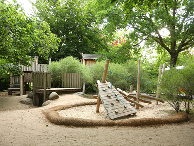 Den Kindern steht ein Kind orientiertes, naturnahes Außengelände zum Spielen und Entdecken zur Verfügung.