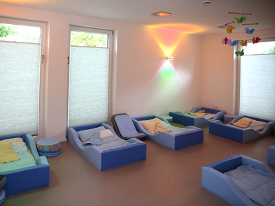 Zum Ausruhen und Schlafen steht den Kindern ein ruhig gelegener separater Raum mit altersentsprechendem Bett zur Verfügung.